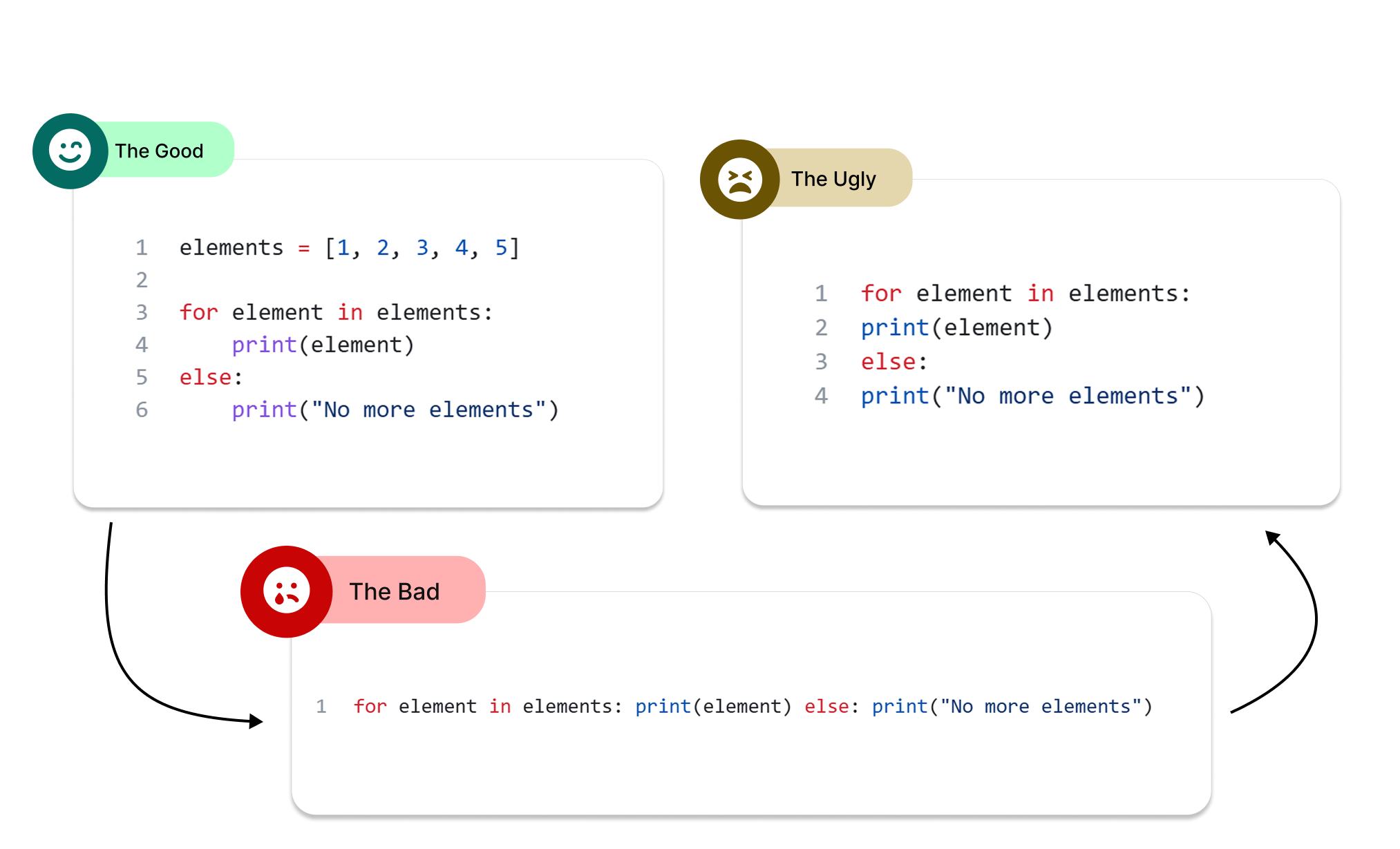 During the time I was a UX designer, we used to categorise designs into one of these three categories; good, bad, and ugly. We, you and me, will do the same with code but first I have a story to tell you. Back in 2001, three Python coders (Guido van Rossum, Barry Warsaw, and Alyssa Coghlan) wrote a style guide for Python code titled “PEP 8” which stands for Python Enhancement Proposal. By the way, this style guide still active today. I want to say here is like in the design where I used to categorise the work into three groups, we have some kind of the same approach here…